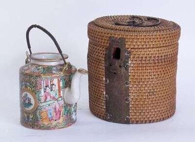 Decorated in the typical palette, within the original whicker case. H: 5 1/4 in.