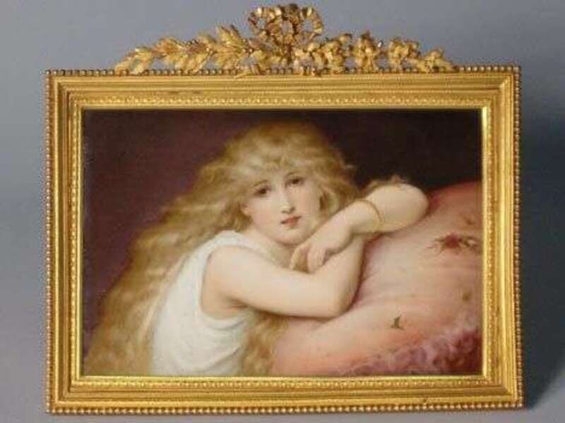 Painted with young beauty with flowing long blonde hair and wearing a white slip with gilt 'jeweled' decoration, resting against a pink cushion, her left arm with a relief gilt bracelet, within a gilt bronze frame, impressed KPM and sceptre mark. H: 6 1/4, W: 9 1/4 in.