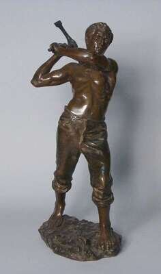 Base inscribed, M. Gamboge, depicted standing, shirtless, with working pants and swinging a mattock. H: 19 1/2 in.