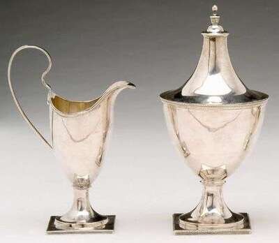 Classical urn form with tall lyre form thread mold handle, beaded rim and square beaded edge base. Stamped on three corners of the underside of the base "L.Heck" and "LH" in a small rectangular box , weight 6 ounces. H: 7 3/4 in. Together with matching covered urn form sugar bowl with egg finial, monogrammed 'KK' on underside of bottom, unmarked, weight 11 ounces. H: 91/4 in..