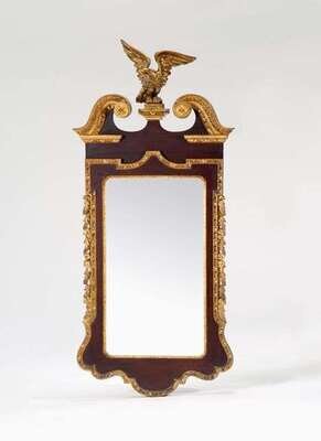 An eagle with outstretched wings centered by foliate scrolls on swan's neck pediment above mirror plate within gilt surround and molded frame, flanked by tendrils, shaped scrolled base. Regilded.