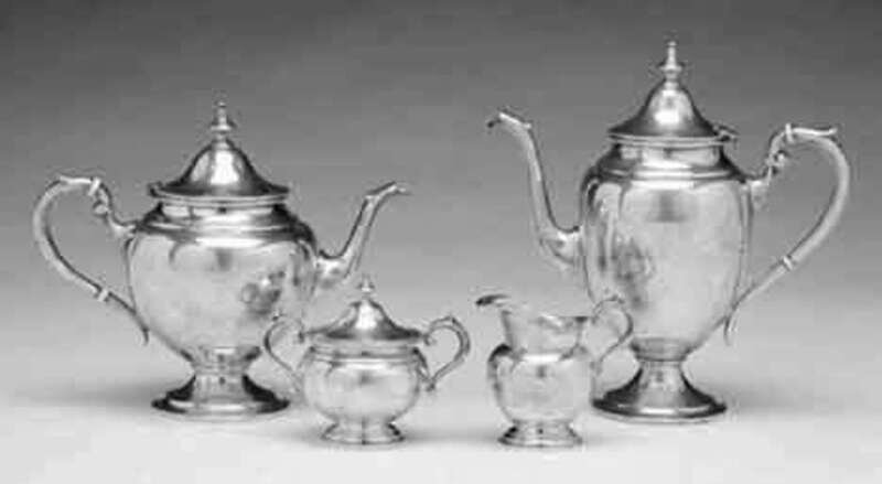 Plain round urn form, urn finials to pots and sugar bowl, lyre-form handles. Including hot water pot, teapot, covered sugar bowl, and creamer. Total weight of set: 48 oz.