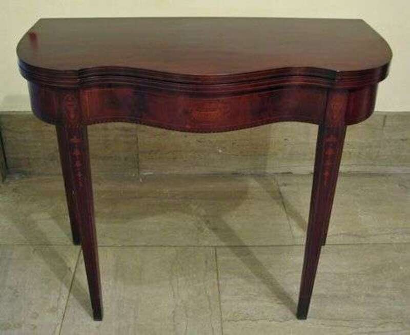 Serpentine top with inlaid edge above frieze inlaid with urns and banding on square tapering legs with line and bellflower inlay.