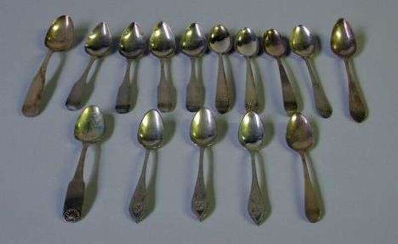 Oval and fiddle handles with monograms, including makers I. Tanguy, Benjamin Buzzy, Daniel Dupuy, J. Shoemaker, William Haverstick, etc. Fifteen pieces..
