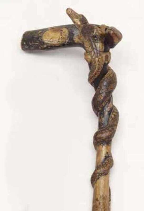 The handle painted with coastal scenes and carved in relief with coiling snake and alligator on a natural shaft. H: 35 in.