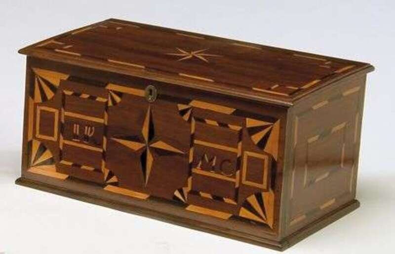 Rectangular form with molded hinged lid inlaid with star and barber-pole banding, on similarly banded case the front inlaid with star flanked by the initials "I R" and "MC" and quarter-fans, molded base. restoration.