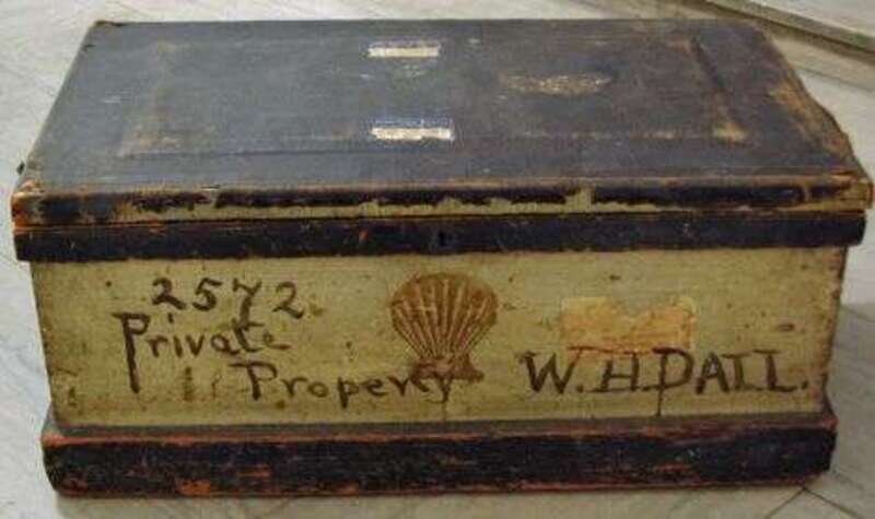 Painted grey and green and decorated with a gilt shell and inscribed "W.H. Dall private property," The lid covered in oil cloth. Worn.