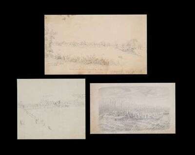 Graphite on paper, framed. The first signed "Edward Pietsch member of the Co. D" and inscribed " Camp Wood Headquarters 14 Reg. NYSM Col. A. M. Wood 1 3/4 mile from Washington 7th 86 D.C.," the second inscribed " Jno Tyler's House, Col. Mallory's of Rebels, now occupied by Capt. Burliegh, and the back further inscribed " Camp of the....Rifles, Col. Webber....." the third inscribed " Skirmishes with guns in the upper Battery at 1010 on the night of the second."