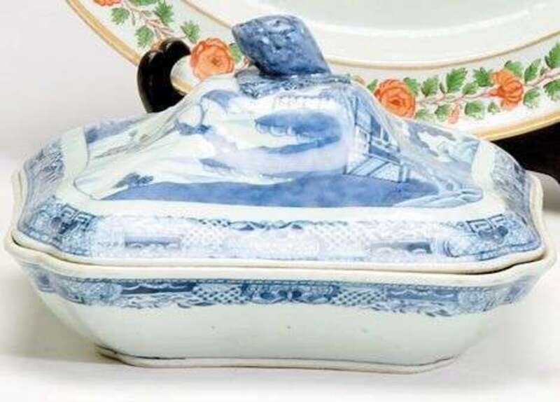 The cone-shaped knop on sloping square top having notched corners and "fitzhugh" border, on conforming dish.