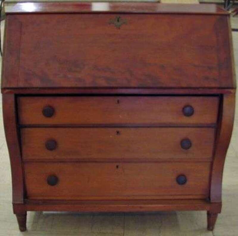 Slant front opens to a fitted interior above three beaded drawers with turned pulls flanked by ogee-shaped pilasters, paneled sides, turned feet.
