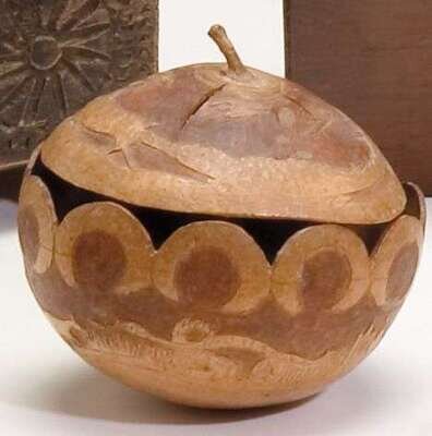 The lid carved with birds, foliage and a fox, the base with scalloped rim carved with figures of people and a lizard, indecipherable paper label on side,.
