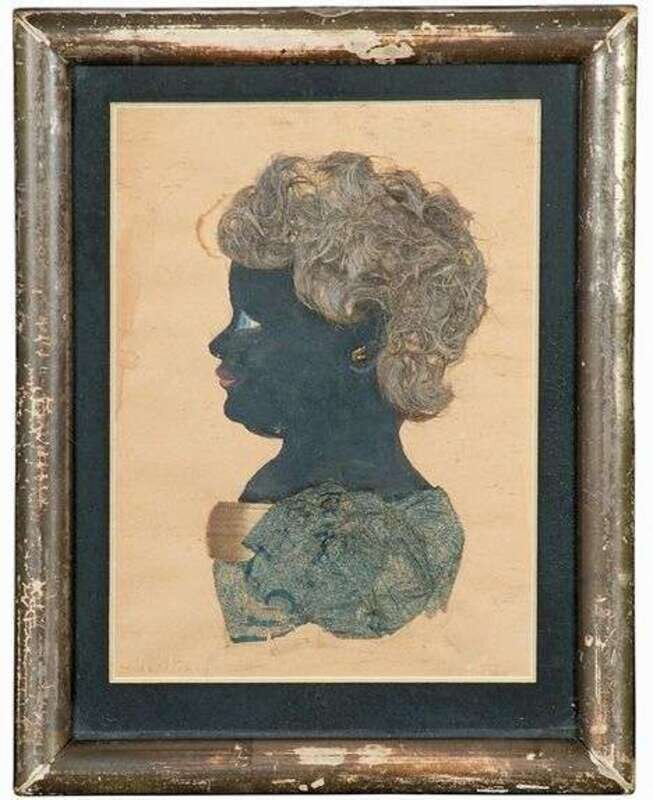 Unsigned, mixed media including paint, hair, gilt metal and fabric on paper, framed. sight 6 3/4 in. x 5 in. discoloration.