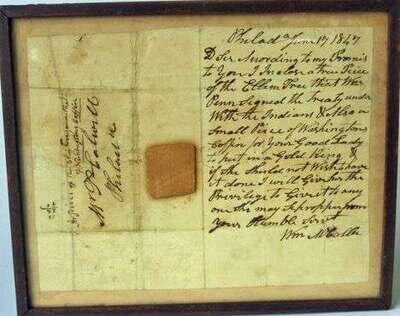 Framed letter with piece of the treaty elm dated philadelphia june 17, 1847