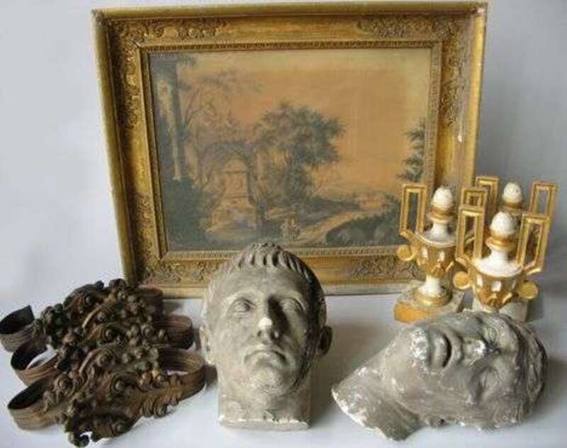 Three urn-form finials painted white and heightened with gilding, two life size plaster heads of men, six stamped brass curtain tiebacks retaining traces of gilding, and a Classical carved giltwood framed with period print depicting romantic landscape. imperfections to group.