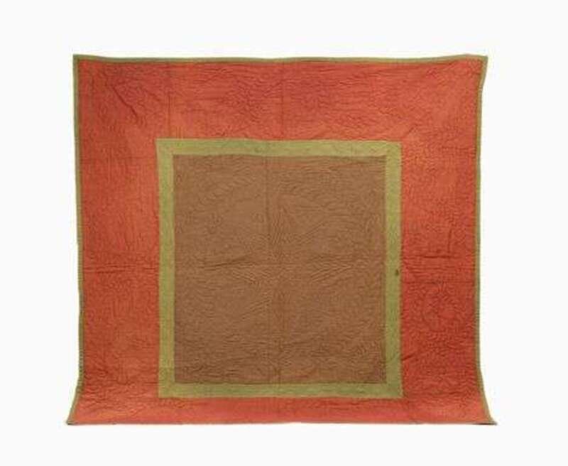 Geometric pattern comprised of brown, olive green and bronze wool heightened with feather, cable, floral and star pattern quilting, the reverse of blue glazed cotton retaining printed paper label " Cambric Cloth." 78 in. x 76 in.