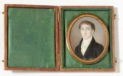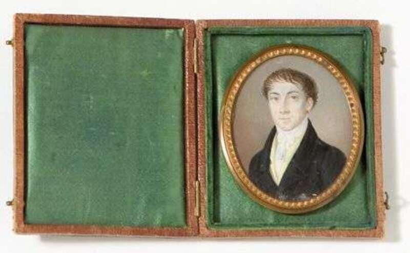 Unsigned, watercolor on ivory, mounted within a leather case, 3 in. x 2 in.