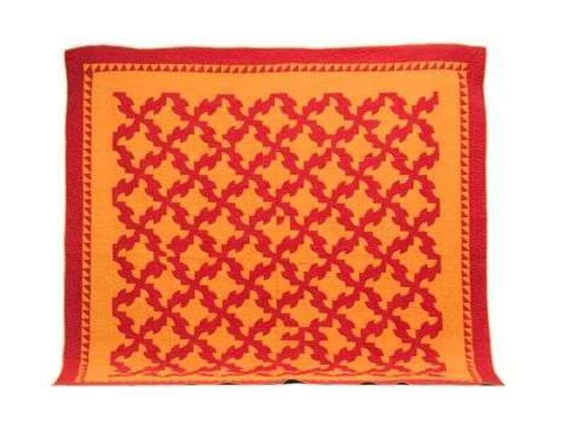 Worked with orange and red cotton patches within a sawtooth border and heightened with conforming flower head and cable quilting.