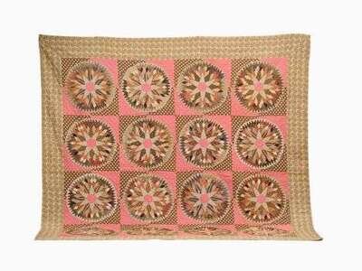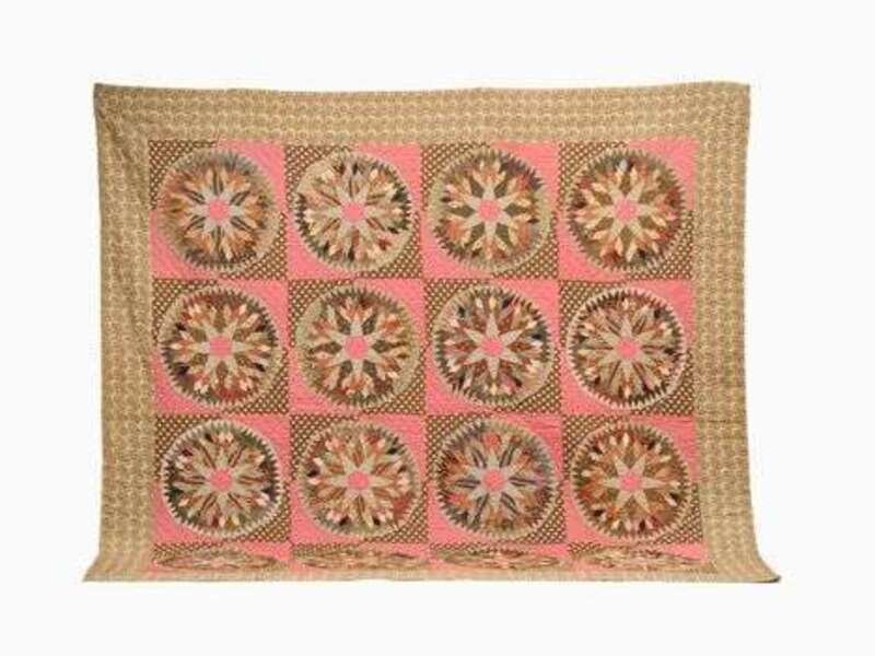 Comprised of printed cotton fabrics in shades of brown, red, green, orange and blue arranged in a sunburst pattern, heightened with diagonal quilting. Some losses.