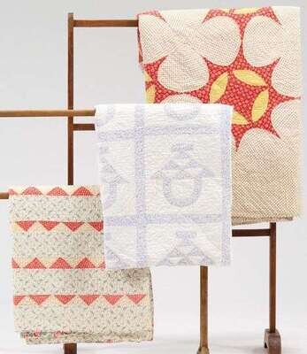 The first comprised of printed cotton patches in red, yellow and white arranged in a "sunburst" pattern, the second comprised of pink and blue floral print on a white ground in a "Basket" pattern, and the third comprised of yellow, green, pink, blue and red in a triangle stripe pattern. some discoloration.