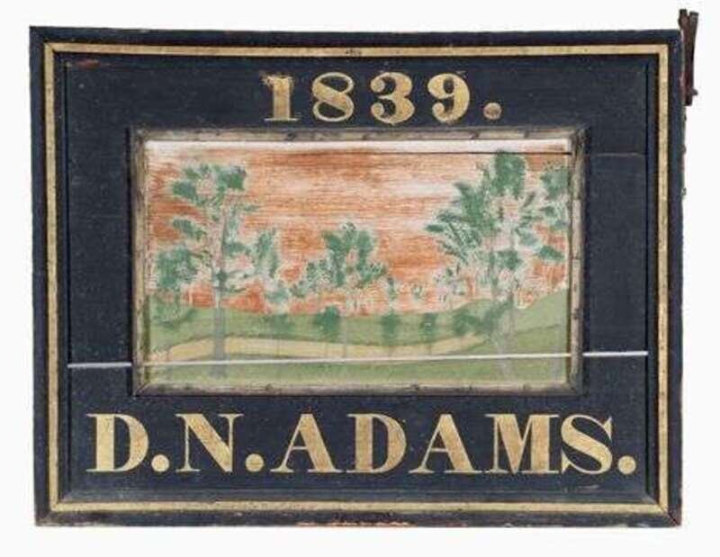 Rectangular form with molded frame enclosing landscape and inscribed "D. N. Adams 1839," painted in black gold, green and bittersweet, wrought iron hardware. some paint wear.