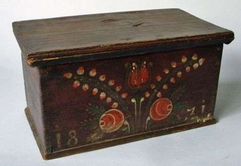 The rectangular molded lid on conforming case with molded base, painted brown, and decorated with tulips and buds in red, white, green . H: 7 1/2 in. W: 14 1/8 in. D: 8 1/4 in. Cotter pin hinges missing, imperfections.
