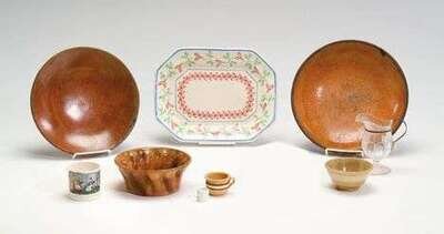 Including two redware plates with coggled rims and a redware mold, a make-do pressed glass creamer, yellow ware cup and bowl, a transfer-printed creamware mug, a miniature mug and a green, red and blue decorated small platter. imperfections.