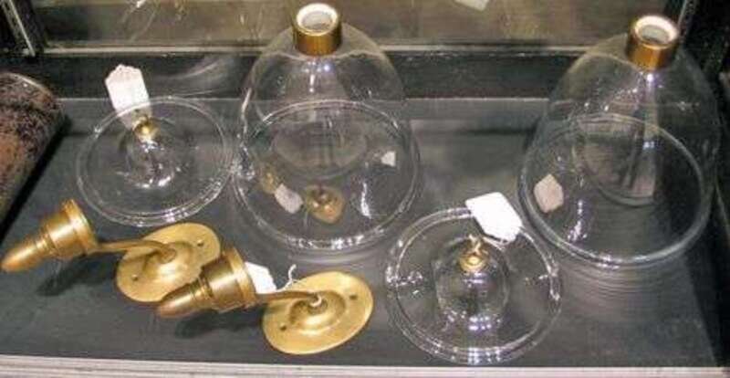 each with oval plate and downsept arm with cylidrical candelcup with acorn-form pendant, uncolored glass shade and smoke bell.