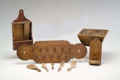 Including a shaped rack with wrought iron hooks, wooden wall box, square box with canted sides, three spoons, paddle and a red painted slaw board.