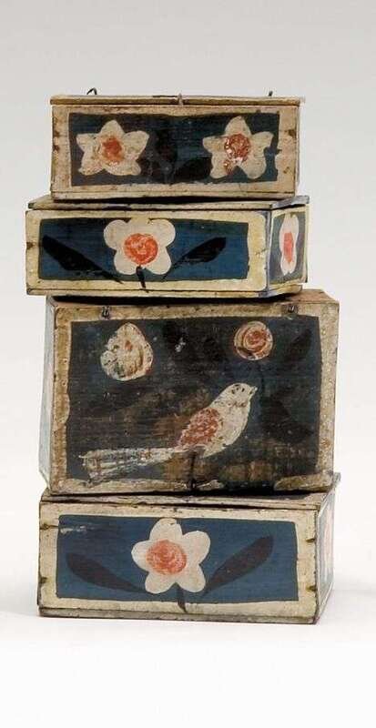 Each of rectangular form with cotter- pinned lids painted blue and white and decorated with red, white, blue and black flower heads, one with bird. Paint loss.