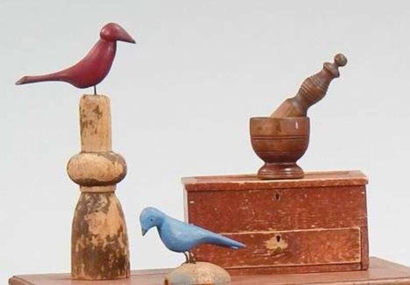 Including two carved and painted birds mounted on wooden stands, a mortar and pestle and a pine one drawer lift lid storage box.