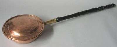 Copper pan with punched decoration having a black painted turned handle, missing ring.