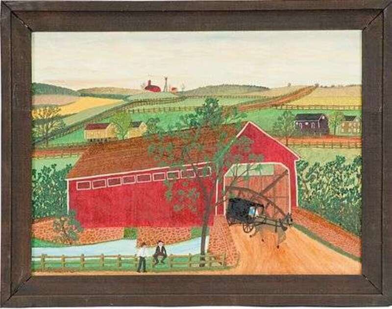 American school 20th century red covered bridge