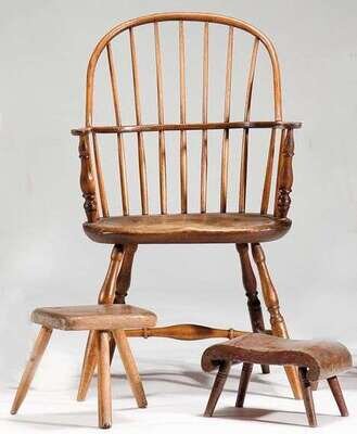 Having turned arms and legs with swelled stretchers, together with two footstools. Potty seat has been filled in.