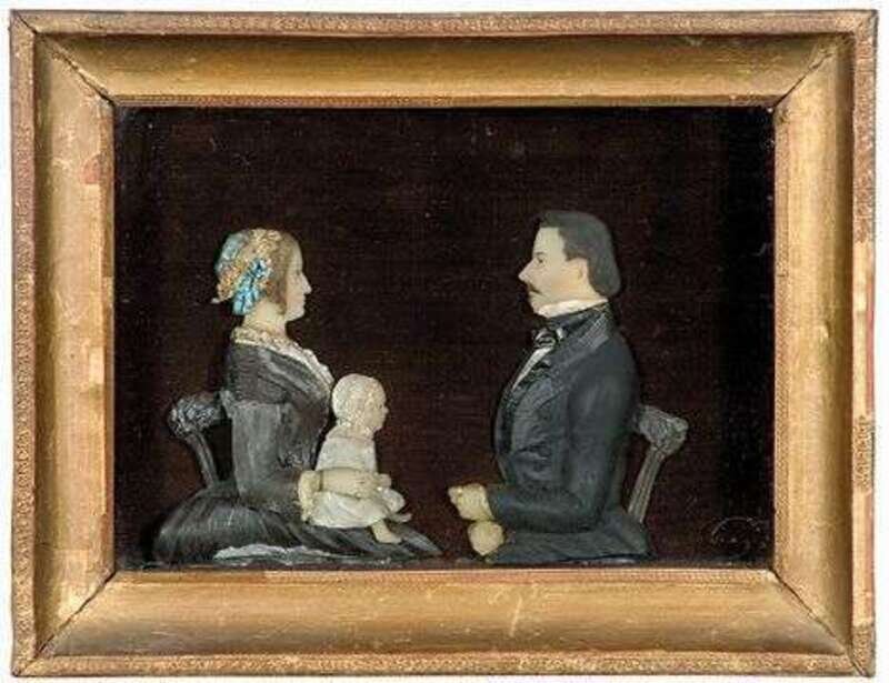Seated half-length figures of gentleman and lady with baby on her lap within frame. 7 1/2 in. x 9 5/8 in.