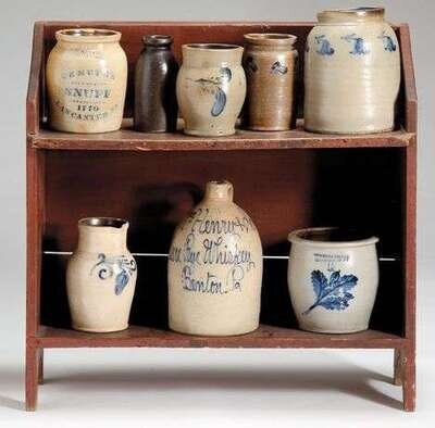 Rectangular back with sloping slab sides having demilune cutouts at base enclosing two shelves. Wear to paint.