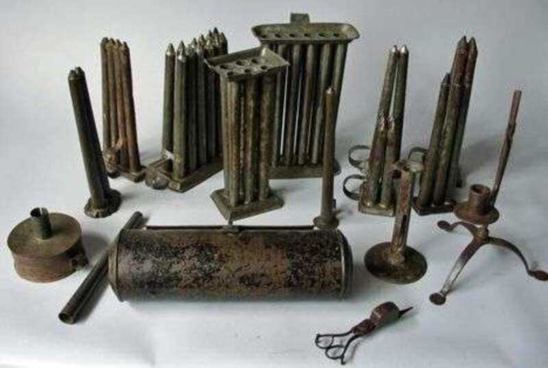 Including a tinware cylindrical hanging candlebox, ten candlemolds, one tinderbox, one hogscraper candlestick, an iron rush lamp with candlecup raised on a tripod base, and a candlestick with conical weighted base and a scissor-form candle snuffer.