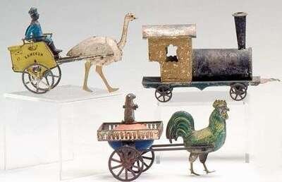 The first a rooster pulling a cart with an egg, the second a "Kamerun" ostrich cart marked Schutz-Marke Musterschutz eingetragen, the third pull toy engine, the "Empire" painted yellow, green and black. paint wear.