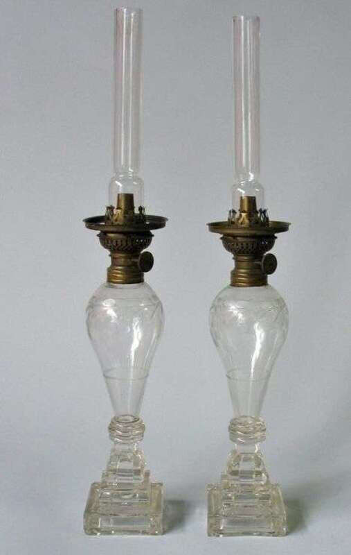 Pair of uncolored etched blown and molded kerosene lamps 19th century