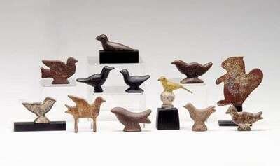 In the forms of birds and a squirrel, retain traces of paint.