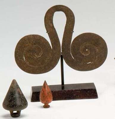 Including a Scroll two cast iron plumb bobs, painted cast iron weight in the form of a bird,.