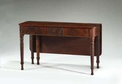 Rectangular top with rounded corners and deep conforming leaf paneled frieze carved with acanthus leaves raised on ring and spiral turned legs ending in peg feet.