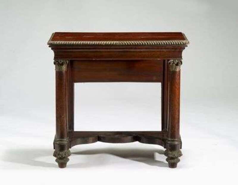 Rectangular top with gadrooned edge and cove molded apron supported by tapering columnar front legs ending in acanthus leaf carved feet joined by a shaped and stenciled shelf. The back is flanked by fluted pilasters, mirror is missing.