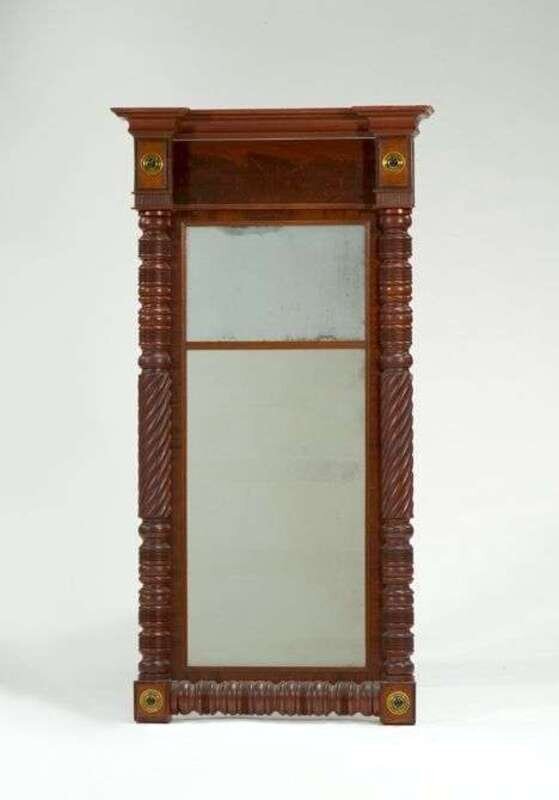 The stepped cornice above conforming entablature with brass and wood bosses supported by ring, reeded and spirally turned split balusters enclosing mirror plate.
