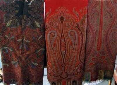 All of traditional paisley design, the first two twill-tapestry woven and pieced, the second a wholecloth with large red center.