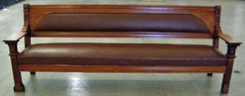 Molded crestrail above upholstered and carved back flanked by corner blocks and fluted stiles, rectangular arms, the upholstered seat on molded rail and fluted legs ending in square feet.