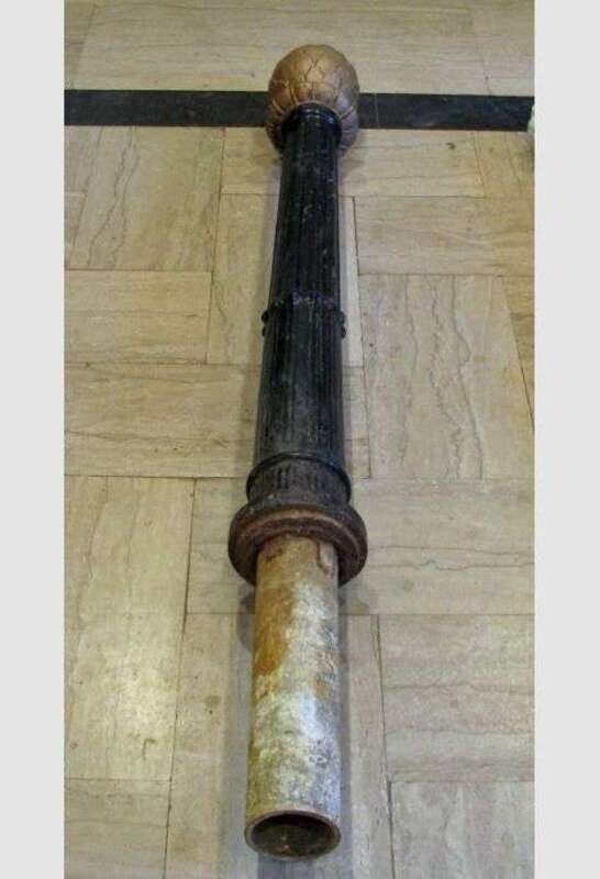 The pineapple finial on tappering fluted shaft, painted gold and black.