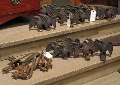 The snow birds in the form of eagles, together with 9 cast iron shutter stays in the form of stars, 36 items.