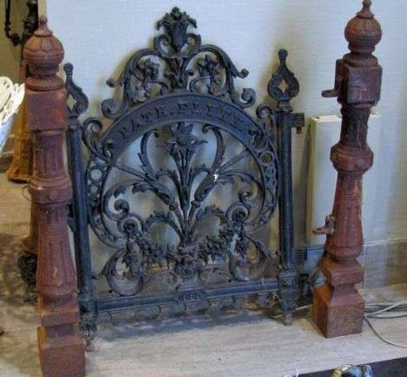 Black painted cast iron gate and posts dated 1885