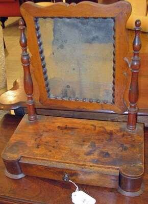 Turned posts with lemon finials hold shaped frame and mirror plate on a shaped rectangular top with single drawer. Some discoloration to top, age cracks. H: 8 1/2, W: 16 1/2, D: 8 3/4 in.