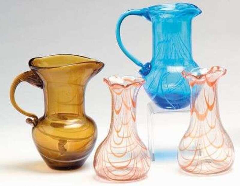 Including two clear looped vases with orange looping by Adolph Macho, a blue looped pitcher and an amber looped pitcher by James Travis.